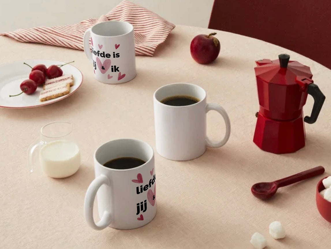 Op zoek naar een lief, persoonlijk en betekenisvol cadeau? Deze stijlvolle mok met de tekst “Liefde is jij en ik” zegt alles wat je voelt, zonder dat je veel woorden nodig hebt. De zachte roze hartjes geven de mok een warme en romantische uitstraling, perfect voor momenten samen.