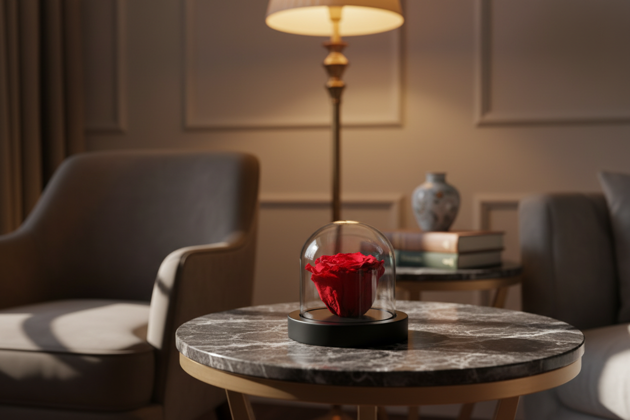 De roos wordt stijlvol gepresenteerd onder een elegante glazen stolp met een zwarte houten basis, wat haar een luxe en tijdloze uitstraling geeft. Een blijvend symbool van liefde dat perfect past in elk interieur. Deze roos bewijst dat ware schoonheid niet vervaagt.