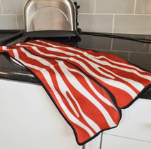 Deze leuke spekvormige en gekleurde theedoek zal je blij genoeg maken om direct na het koken schoon te maken.